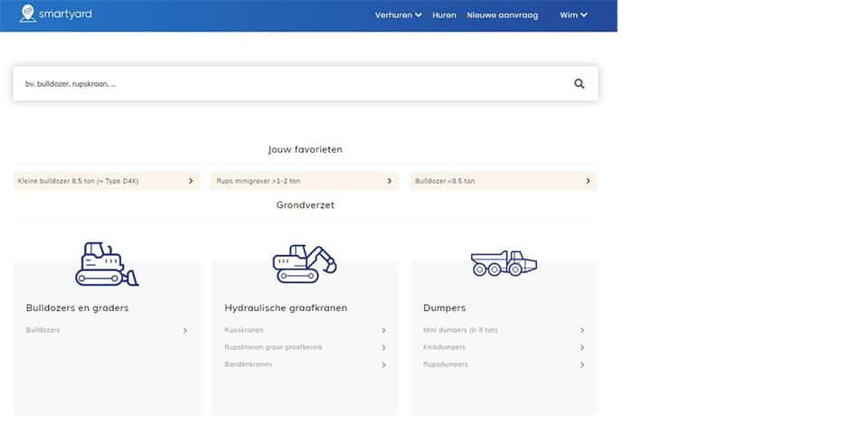 Door digitaal te gaan centraliseert Smartyard alle informatie. En sinds de lancering in mei is het aanbod via Smartyard al sterk gegroeid. Yannick Renier: “We verzamelden al meer dan 1.000 unieke tuigensoorten en duizenden SKU’s. Bulldozers en graders, hydraulische graafkranen, dumpers, wiel- en rupsladers, verdichtingsmachines, aanbouwstukken, verreikers, heftrucks, hoogwerkers, schaarliften, tot zelfs stroomgroepen, lichtmasten en mobiele toiletten.